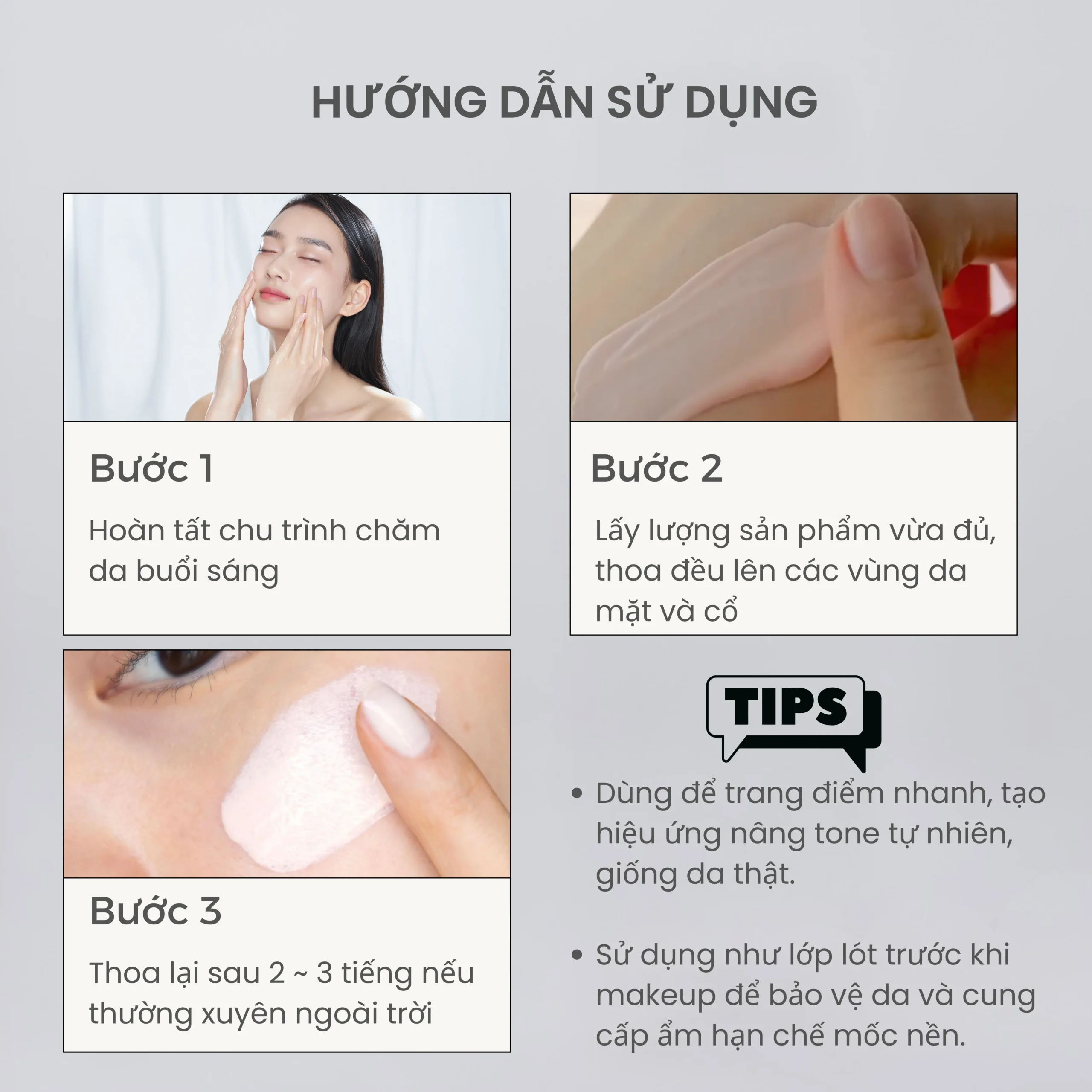 4, Có thể dùng là kem lót trước khi trang điểm. Hoặc sử dụng để trang điểm không dùng kem nền khi cần trang điểm nhanh, tạo diện mạo trong veo, có hiệu ứng tone-up tự nhiên giống da thật.