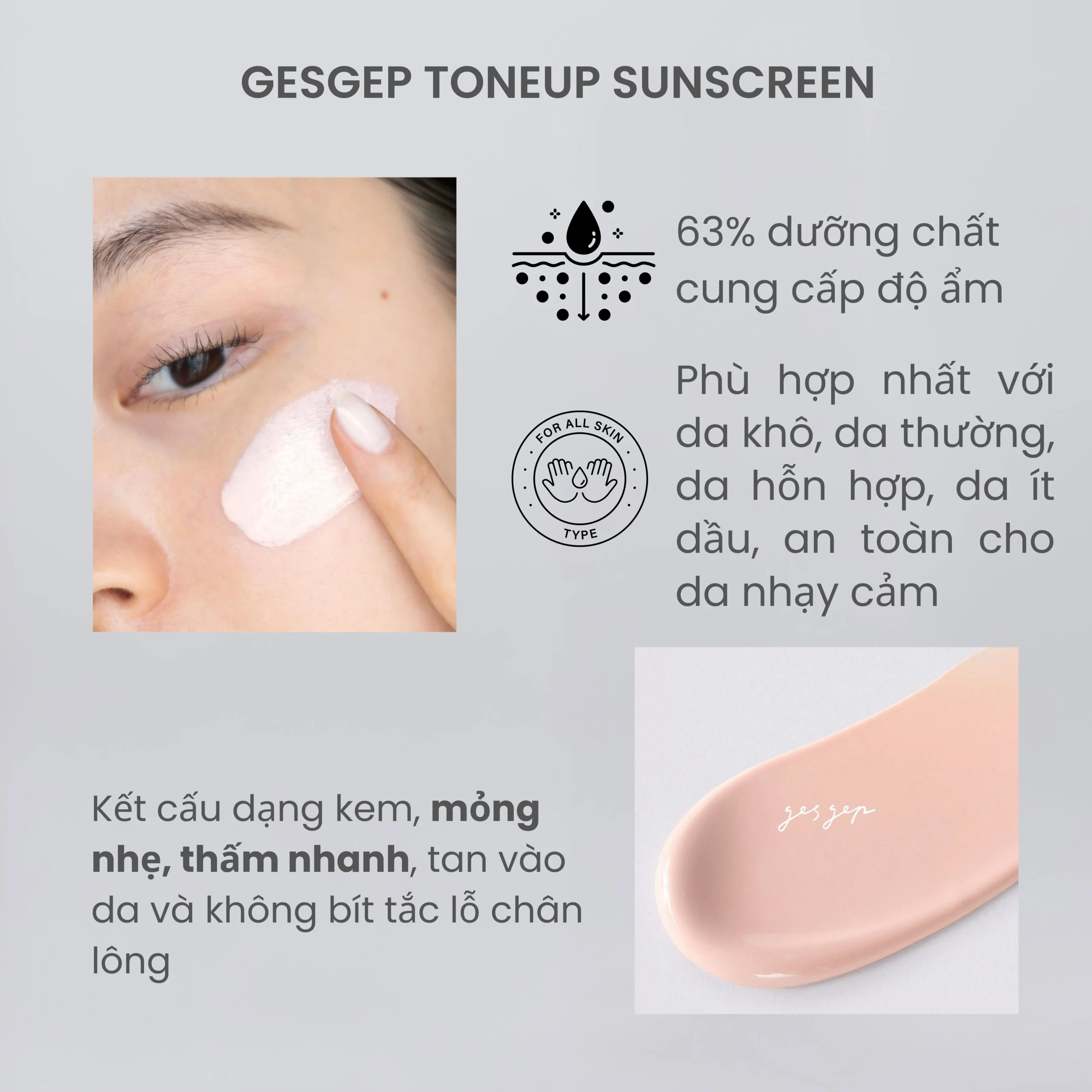 Không những bảo vệ da tránh khỏi tác động của tia UV với chỉ số chống nắng cao SPF 50+, PA++++, Gesgep Tone Up Sunscreen với thành phần chiết xuất từ thiên nhiên cấp ẩm cho da lên tới 63%, nâng tone da trắng hồng tự nhiên và còn được sử dụng để làm kem lót trước khi trang điểm.