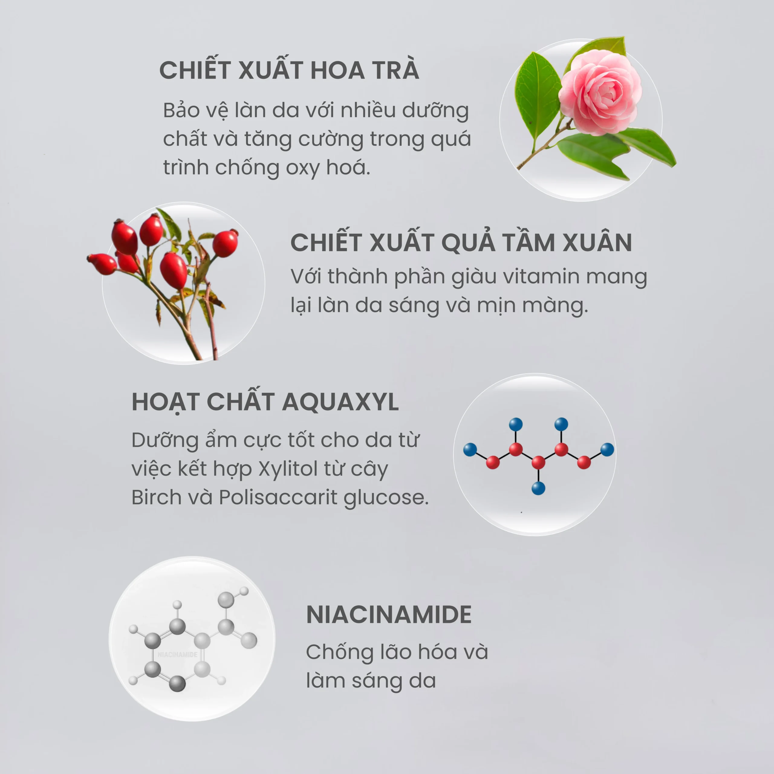 – Kết hợp thành phần chống lão hóa như Niacinamide, Adenosine, Tocopherol