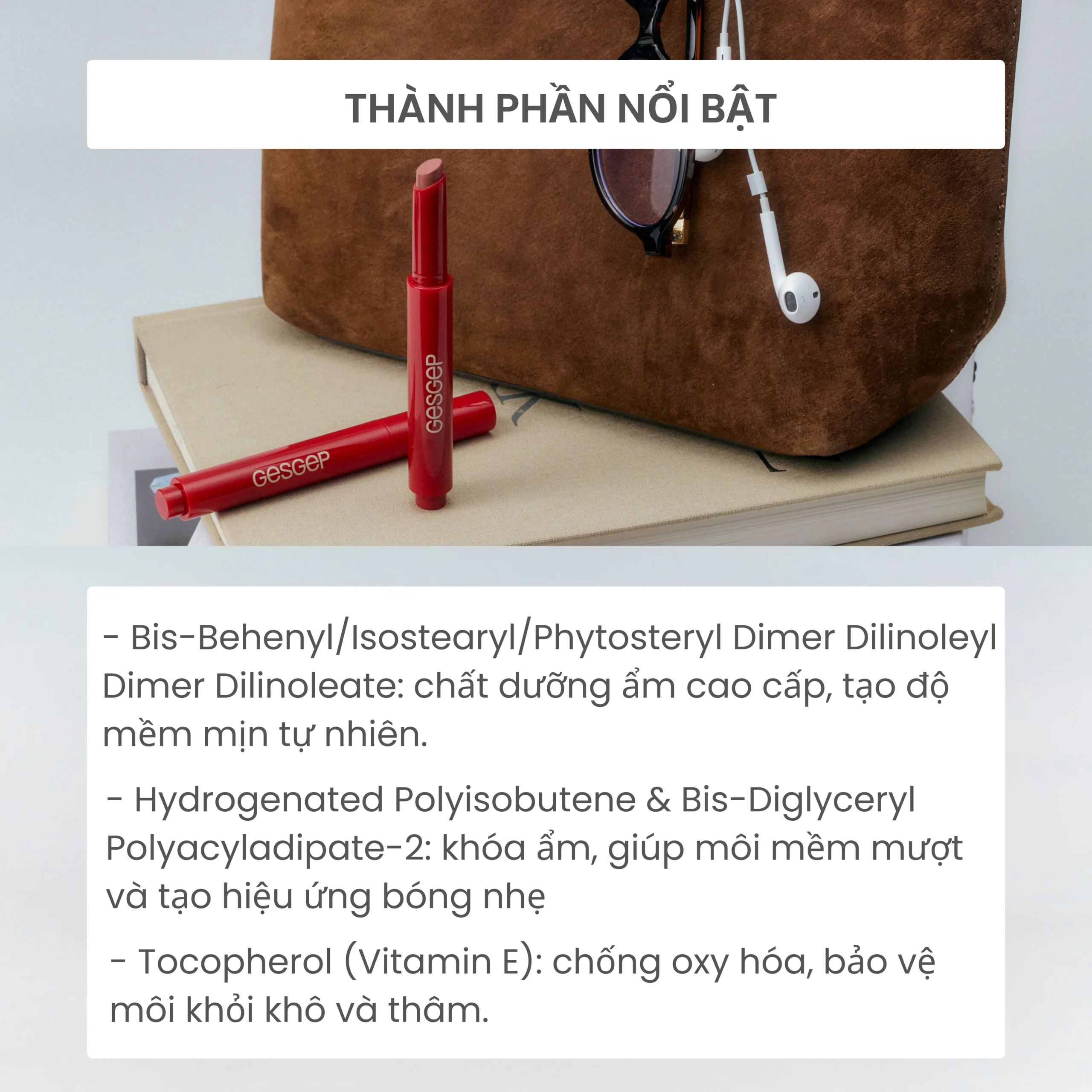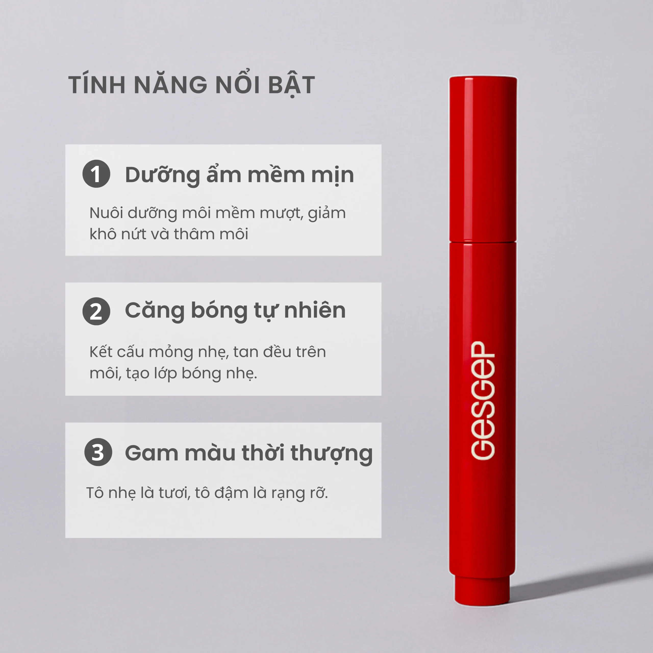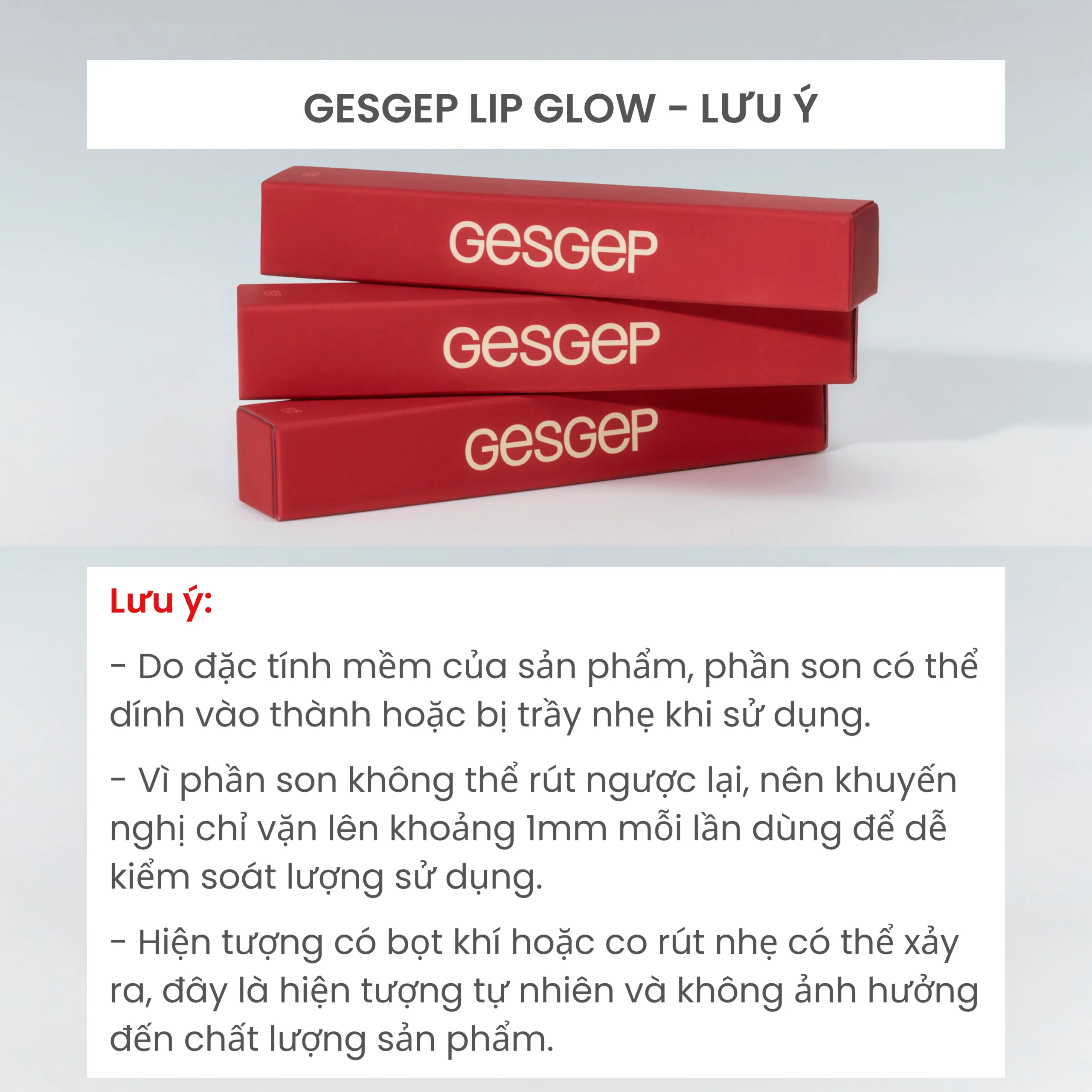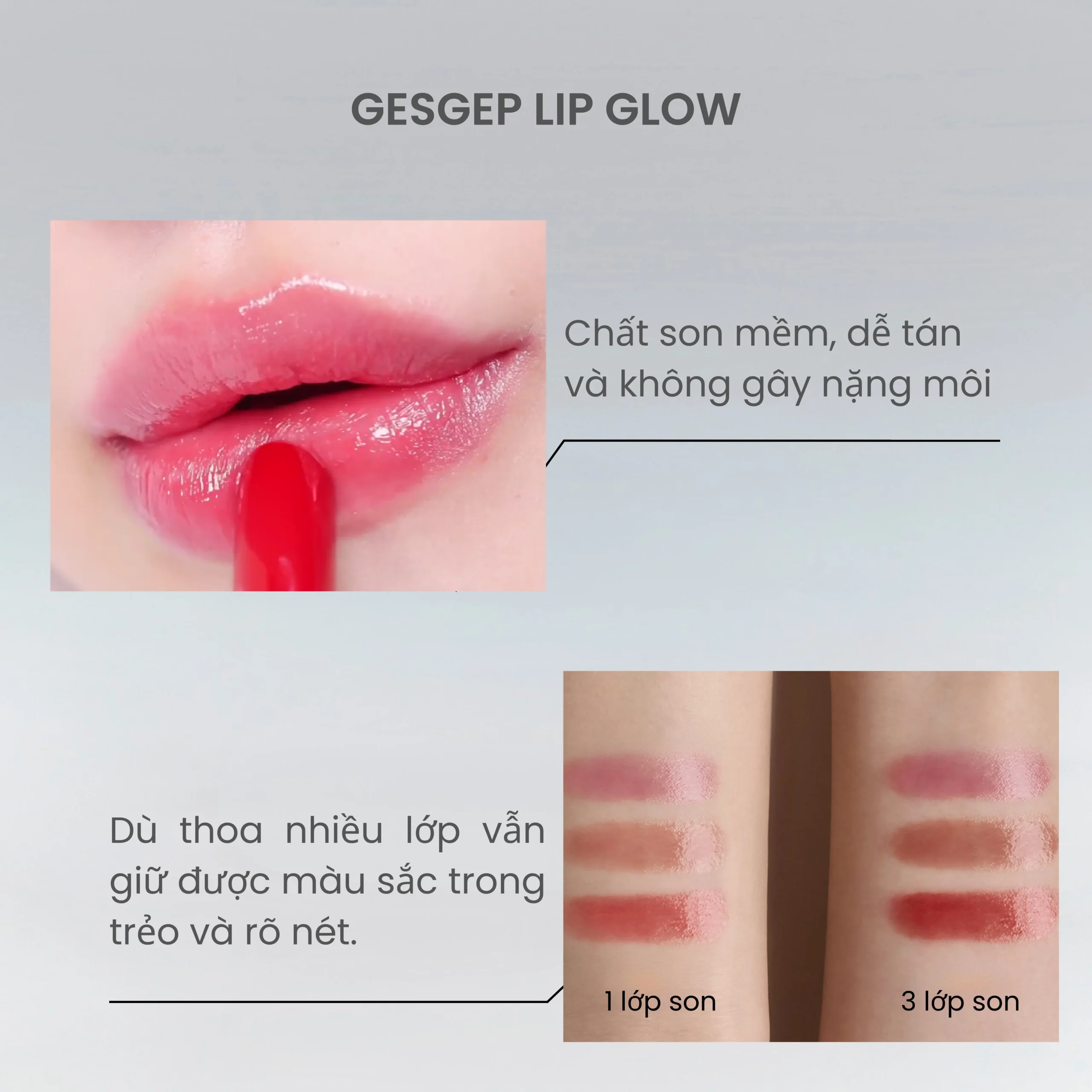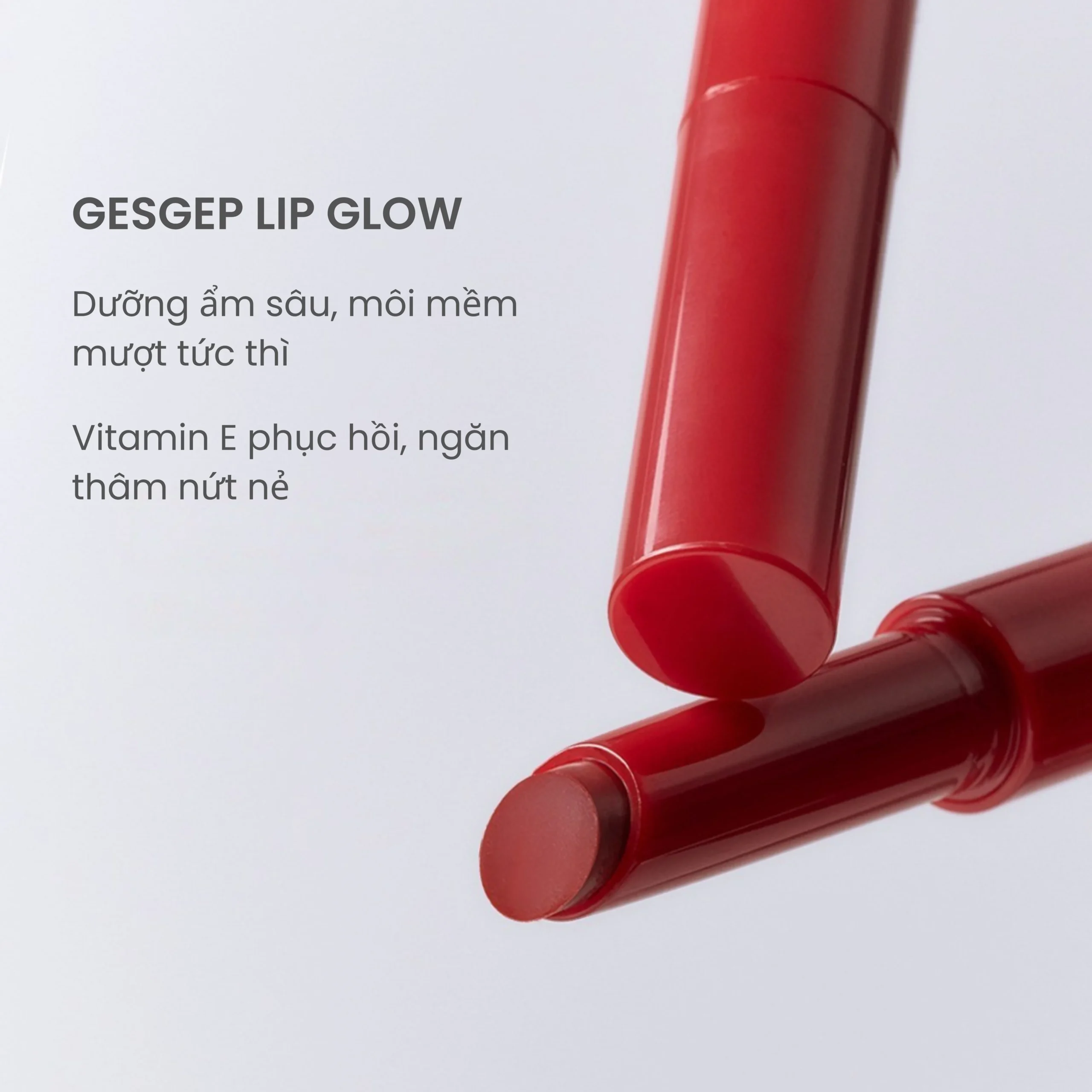 Gesgep Lip Glow là thỏi son dưỡng có màu mang đến làn môi mềm mượt, căng bóng nhẹ và rạng rỡ tự nhiên chỉ sau một lần thoa.